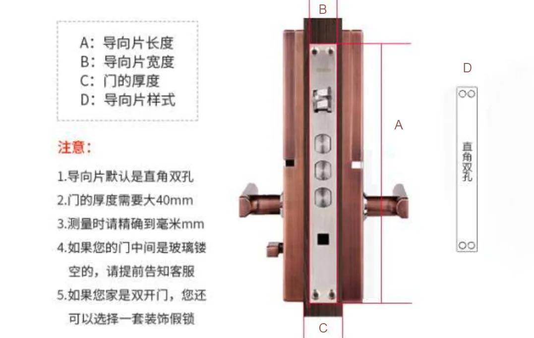 首先要確認(rèn)的是導(dǎo)向片的長度A、寬度B和樣式D。如果你買的長度A、寬度B或樣式D與原來的導(dǎo)向片不一樣,那就需要安裝師傅重新開孔,安裝費(fèi)也會(huì)水漲船高,甚至無法安裝。最后門的厚度C也要測(cè)量,這關(guān)系到你購買的門鎖是否能夠裝的上,通常普通入戶門的厚度都能夠支持。按照以上方案進(jìn)行測(cè)量,再把數(shù)據(jù)記錄準(zhǔn)確即可。